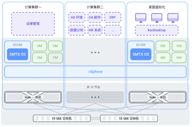 采用(yòng)VMware服務(wù)器虛拟化平台實現對企業數據中(zhōng)心資源的虛拟化整合,Citrix桌面雲解決方案提供前端業務(wù)應用(yòng),SmartX超融合系統替代傳統集中(zhōng)式存儲架構,在實現數據資源整合的同時,确保集團内數據、應用(yòng)、計算虛拟化平台具(jù)有(yǒu)HA、FT、DRS 等高級功能(néng),可(kě)保證整合後的平台穩定可(kě)靠運行。